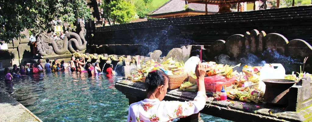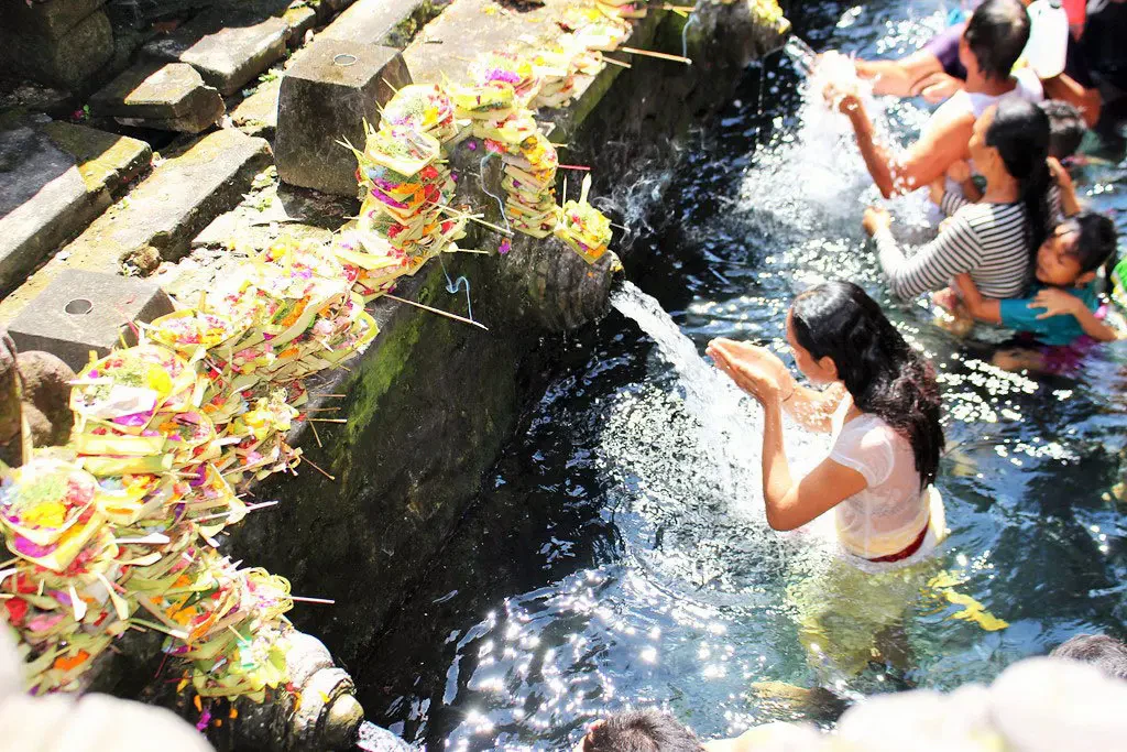 Vor dem Bad werden auf einem Altar vor dem Becken Opfergaben in Schilfkörbchen mit qualmenden Räucherstäbchen dargebracht. Vor dem Becken bilden sich heute sogar eine richtige Schlange, weil vorher im Tempelinneren eine Zeremonie statt gefunden hat. Es ist ein buntes faszinierendes Bild: Menschen in bunten Sarongs vor den Wasserspeiern, die rauchenden Opfergaben …