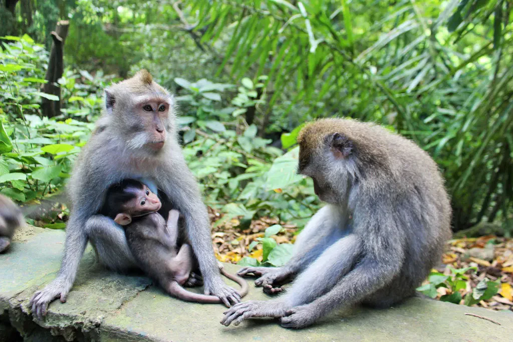 Am Ende der Monkey Forest Road liegt der Affenwald: Der magisch anmutende Wald mit alten riesigen Bäumen beherbergt Hundertschaften frecher Monkeys, insgesamt leben hier rund 300 langschwänzige Affen. Der Eintritt in den Affenwald ist eine kleine Spende für den Erhalt des Waldes. Paul ist gleich kurz nach unserem Ankommen ganz entzückt von einem kleinen Affenbaby, das am Hals seiner Mama hängt.