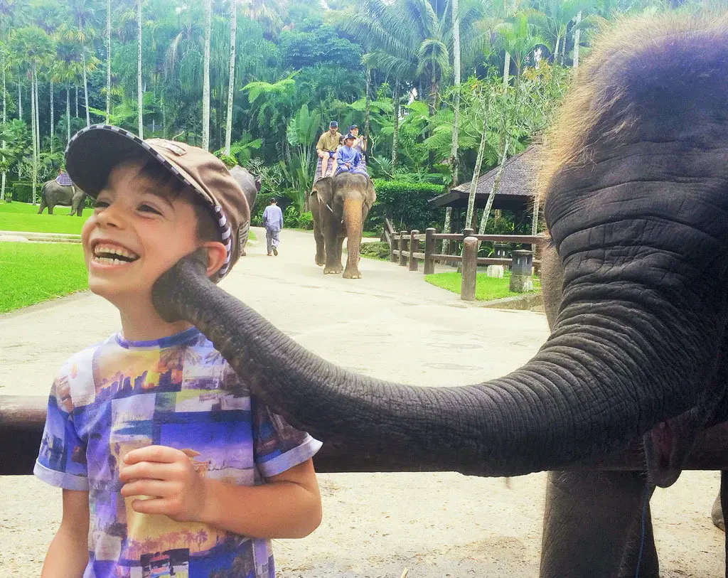 Die Dickhäuter sind aber nicht nur sportlich, nein, ein Elefant schwingt sogar den Pinsel und malt Bilder, die man anschließend kaufen kann. Und am Schluss der Show, pustet ein lustiger kleiner Elefant einfach die Zuschauer nass- die Kids sind happy. Unser größtes Highlight ist aber, als wir auf einem Elefanten durch den Dschungel reiten dürfen. Paul und ich sitzen auf einem Holzsitz und vor uns der Mahud. Langsam schaukeln wir los. “Ist unser Elefant ein Junge? Der Mahud erklärt, dass nur männliche Elefanten Stoßzähne haben. Tibo heisst unser Dickhäuter und er ist 8 Jahre alt und einer der größten hier im Park. Nach unserem Ausritt ist noch viel Zeit, um Fotos mit Tibo zu machen. Neben Tibo taucht noch ein dreijähriges Baby-Elefantenmädchen auf, die Paul ein Küsschen gibt. Ganz entspannt dürfen wir die Elefanten füttern, sie streicheln und auf einen wink des Mahuds legt Tibo mir mit seinem dicken rauhen Rüssel um den Hals und wir machen lustige Fotos. Alle Tierpfleger sind hier sehr nett, offen und sie scheinen alle die Tiere und ihren Job zu lieben… Der Erlös der Eintrittsgelder kommt übrigens dem Erhalt der vom Aussterben bedrohten Sumatra-Elefanten zugute.