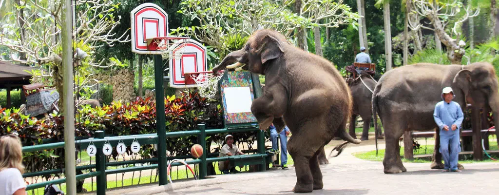 Hier im Elefant Safari Park kann man die Dickhäuter live erleben! Die Sumatra-Elefanten werden hier artgerecht gehalten. Jeder Elefant wird gehegt und gepflegt von seinem Mahud. Gleich am Anfang unseres Besuch sehen wir eine echt tolle Show. Paul ist ganz begeistert, als die Elefanten sogar Fußball spielen. “Tor!” Und Basketball geht auch! Es sieht wirklich lustig aus wie der Elefant sich auf zwei Beine stellt und den Ball locker mit seinem Rüssel in den Korb wirft.