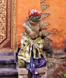 Direkt an der zentralen Kreuzung in Ubud befindet sich der Königspalast “Puri Saren”, die ehemalige Residenz des Rajas, des Königs von Ubud. Die Nachkommen des Rajas leben heute in einem kleinen Privattrakt, der Rest ist zur Besichtigung frei gegeben. Es ist schön durch die Höfe und den Garten zu schlendern. Hier finden Sich prächtig verzierte Bauten aus dem 19. Jahrhundert. Wir machen lustige Fotos mit den schaurig grinsenden Steinfiguren. Gleich gegenüber vom Königspalast ist der Ubud Market, hier kann man wunderbar Mitbringsel wie Tücher, Armbänder und so weiter kaufen …