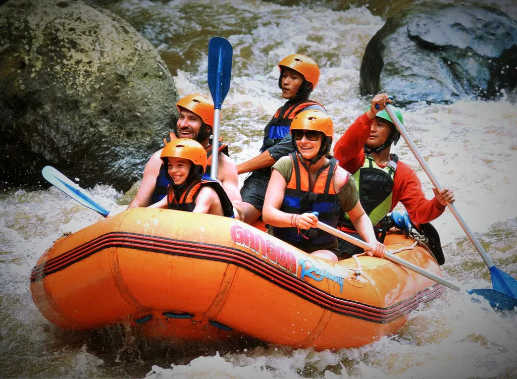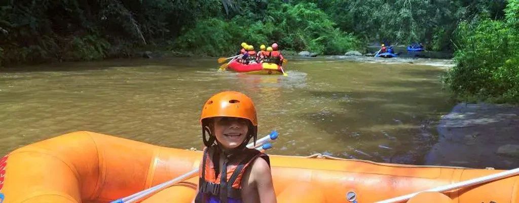 Überall in Ubud stehen Schilder mit Werbung für Aktivitäten. Paul zeigt jedes Mal auf die Fotos vom Rafting auf dem “White River”. Zum Glück haben wir das schon gebucht! Vom Taxifahrer werden wir morgens am Hotel abgeholt. Vor Ort beim Rafting-Headquarter ziehen wir uns Badesachen an und bekommen Helme, Schwimmwesten und Paddel. Dann geht´s noch mal mit einem kleinen Laster an den Rand des Dschungels. Mit Paddeln laufen wir über ein Reisfeld und dann geht es schmale Wege und Treppen durch den Urwald runter zum Fluss. Auf dem Weg hören wir schon das Rauschen des Wassers und laute jauchzende Schreie.