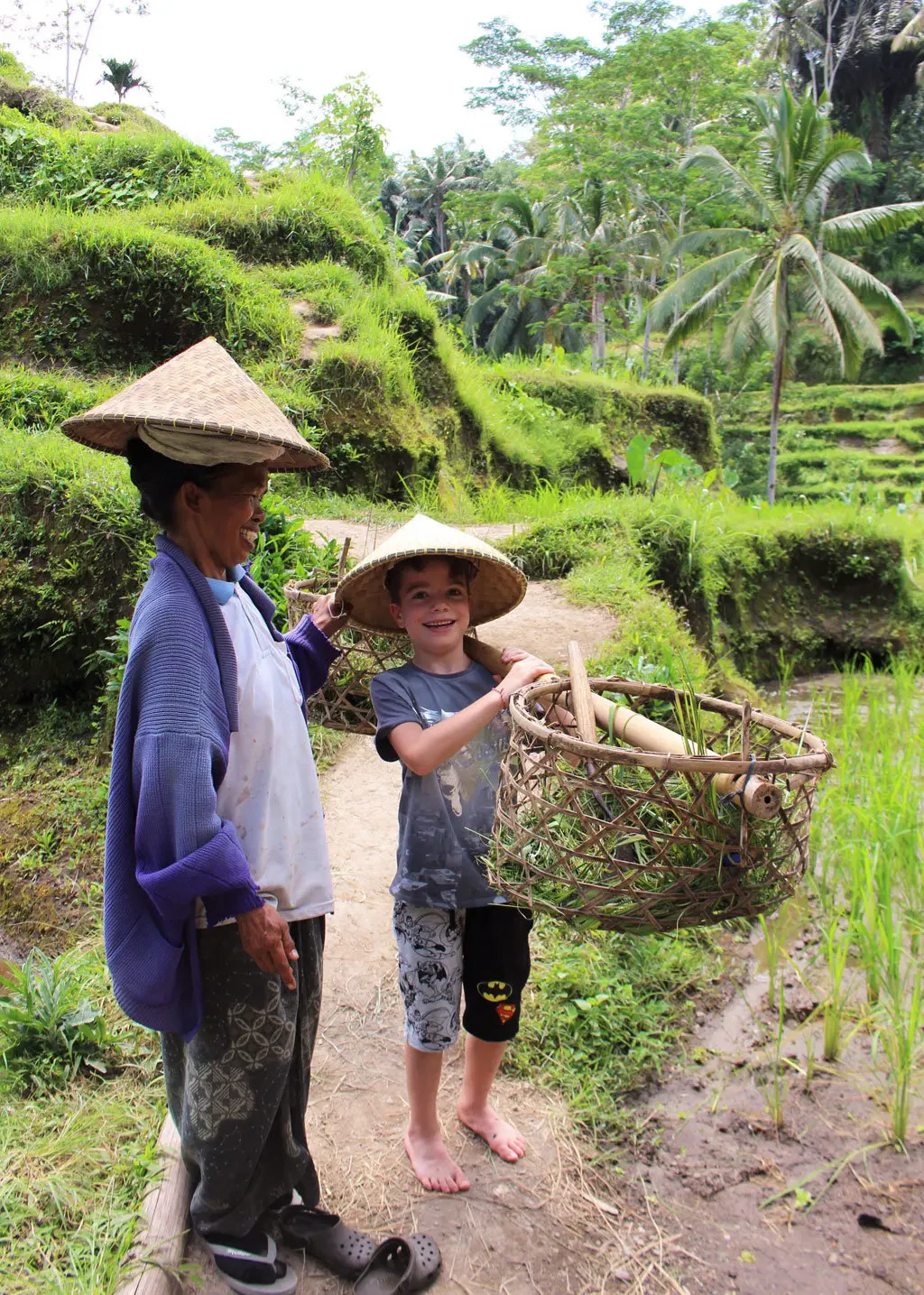 Oben an der Strasse ist ziemlich viel los es reiht sich hier ein Sovenirshop an den anderen. Deshalb sollte man möglichst früh kommen. Es lohnt sich auch für 1-2 Stunden hier zu wandern und den Ausblick von der anderen Seite zu genießen. Wir klettern in der Hitze von Reisterrasse zu Reisterrasse und bewundern wie perfekt diese Bewässrungs-System ist. Paul darf die Reistrage fürs Foto auf die Schultern nehmen, alles für eine Spende natürlich. Beim Fotografieren rutsche ich aus und versinke mit einem Bein im Reisfeld. Beinahe hätten wir meinen Flip-Flop nicht mehr im Schlamm gefunden. Paul lacht sich kaputt. Das war bis jetzt das Lustigste, Mama!” Nach unserem Ausflug ins Reisfeld besuchen wir ganz in der Nähe, nur 5 Minuten Fahrzeit entfernt eine Coffee Plantage.