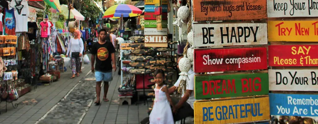 Wir kaufen uns bunte Holzschilder mit “Family-Rules” für unsere Küchenwand zuhause. Unser Tipp: Unbedingt handeln! Während auf dem Market eher billige Massenware angeboten wird, finden sich in den umliegenden Straßen Galerien, Shops und Boutiquen im Herzen Balis mit wunderschönem Kunsthandwerk. Viele individuelle Dinge kann man hier erwerben, vom Kleid über Schmuck bis zu tollen Wohn-Accessoires.