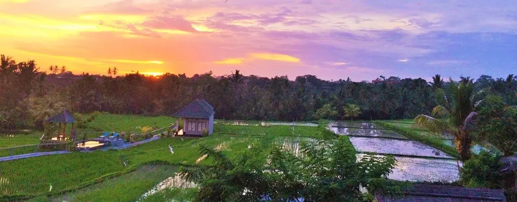 Wir haben Glück und bekommen den letzten Tisch mit Blick zum Reisfeld. Alle anderen haben wohl vorher reserviert. Wir genießen sehr lecker typische balinesische Gerichte, alles ganz frisch. Das Warung Bodag Maliah ist bei dem Bio-Bauernhof Sari Organik angeschlossen. Das biologische Essen, Saft und Smoothies sind wirklich toll und sehr hübsch angerichtet. Mein Tipp: Unbedingt den rosa Reiswein bestellen! Die Aussicht ist atemberaubend! Direkt neben uns bestellt ein Farmer ein Reisfeld und langsam färbt sich die ganze Szenerie lila-orange. Die Sonne geht langsam unter. Alle zücken die Foto-Apparate und Smartphones. Mit den Fotos bin ich aber unzufrieden, diese Szene kann man nicht fotografieren… ich versuche sie mir ganz fest einzuprägen …