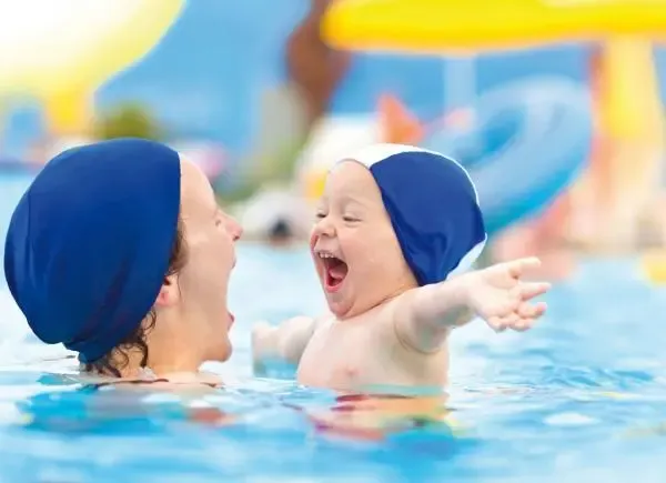 Hier bleibt keine Badehose trocken: Neben Deutschlands längster Hotel-Wasserrutsche mit 128 Metern gibt es Baby- und Kinder-Schwimmkurse, die man einfach dazu buchen kann.