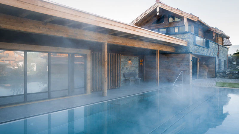Unser Tag startet mit einem besonderen Highlight: der Frühstückskorb, der jeden Morgen mit viel Liebe von Heinzelmännchen ins Chalet geliefert wird. Als wir aufwachen duftet es nach frisch gebrühtem Kaffee und wir schauen gleich mal nach was uns da gebracht wurde: frisch gebackenes Brot, Brötchen, Obstsalat, Bircher Müsli, feine Aufstriche, Lachs und eine Auswahl an anderen Leckereien – so beginnt der Tag einfach traumhaft. Wir sitzen stundenlang im Schlafanzug und quatschen. Noch ein Kaffee, noch ein Brötchen… wir könnten noch ewig da sitzen, aber die Sonne lockt uns nach draußen zum Schwimmen. Der beheizte Outdoorpool wartet darauf, uns wach und erfrischt zu machen. Ein Sprung ins warme Wasser am Morgen vertreibt noch die letzten Schlafgeister und macht den Kopf frei für neue Eindrücke. Zum Aufwärmen lädt direkt dort am Pool die finnische Sauna ein. Wir wollen aber lieber die eigene Sauna in unserem Chalet testen, die wir bereits eine halbe Stunde vorher angeheizt haben. Wir sausen schnell zurück, denn draußen ist es eisig kalt und freuen uns auf die wohlige Wärme in der Sauna. Wir schwitzen zusammen, reden, lachen, bis es uns zu heiß wird. Danach ist Zeit für Entspannung auf der Terrasse im Hotpot angesagt, wo kühler Außenwind auf prickelnde Wärme trifft. Den Hotpot haben wir auch schon vor einiger Zeit vorgeheizt, damit er auch so richtig warm ist. Also kurz unter die kalte Dusche und dann rein in den Pot. So cool mitten im Winter draußen im warmen Wasser zu sitzen. Wir schnattern munter weiter und sind einfach happy.