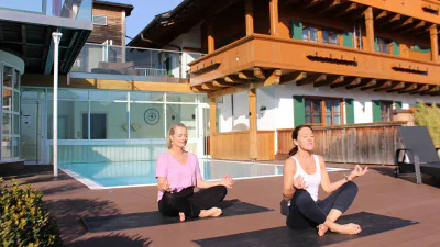 Morgens scheint die Sonne in unser Zimmer und Neuschwanstein liegt noch etwas verwunschen im Nebel – Kaiserwetter im November, Sonne wie bestellt. Zum wach werden wartet ein großes Schlemmerbuffet auf uns mit allem was das Herz begehrt: Frische Früchte, Brotecke, regionale Käse- und Wurstspezialitäten, hausgemachte Aufstriche, Honig aus dem eigenen Bienenstock, warme Eier- und Süßspeisen, frische Säfte, Sekt, Joghurt- und Gemüseauswahl. Nach dem leckeren Frühstück erkunden wir erst mal zu Fuß die Umgebung. Herrlich so ein Herbstspaziergang vorbei an Höfen und Pferdekoppeln und dahinter ein herrliches Bergpanorama. Zurück im Rübezahl steht erstmal eine kleine Yoga-Session auf dem Programm. Franzi, unsere Yoga-Lehrerin geht dazu am liebsten raus in die Natur. „Also für mich sind die Berge und die Natur besondere Kraftplätze. Yoga hat für mich einen ähnlichen Effekt, deshalb ist diese Kombination für mich einfach besonders“, sagt sie. Warum Yoga überhaupt happy macht lest ihr hier: Interview mit Franzi Wir finden gemeinsam ein hübsches Plätzchen auf dem Holzdeck im Garten direkt neben dem Pool vor der beeindruckenden Berg-Kulisse mit den Märchenschlössern. Bei Sonnenschein atmen wir die frische Bergluft ein und biegen uns in den Hund, strecken uns in den Krieger und sind dankbar und happy mal den Kopf auszuschalten und zu entspannen.