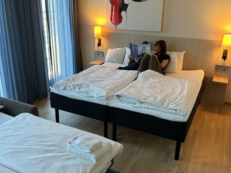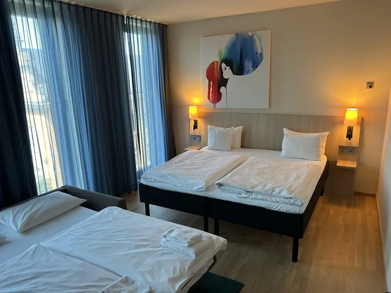 Wir haben uns für ein Familienzimmer entschieden – eine kluge Wahl, wie sich zeigt. Das Zimmer ist großzügig geschnitten, mit einem gemütlichen Doppelbett für uns Eltern und einem Schlafsofa für die Jungs. Alles ist sauber und durchdacht eingerichtet. Ein Wasserkocher, Tee und Instant-Kaffee stehen parat. Was uns besonders wichtig ist in der Stadt: Dass die Fenster gut isoliert sind und wir trotz der zentralen Lage ruhig schlafen können.