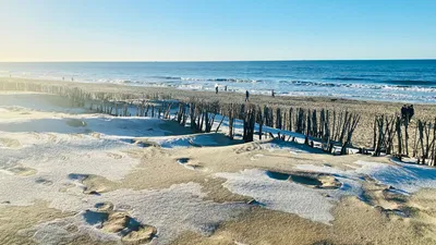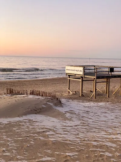 Ein Stück folgen wir einem Holzweg, der besonders typisch ist für Sylt. Diese Stege mit Holzbohlen schützten die Dünenlandschaft und helfen dabei, an die gewünschten Stellen zu gelangen. Bei Wenningsstedt gehen wir dann den Schnee bestäubten Holzsteg zur Düne hoch. Oben angekommen treffen wir auf lustige Skulpturen und diesmal auf dem Aussichtskliff auch auf den großen Gosch. Der Himmel färbt sich langsam rosa-orange, also Zeit für einen Sundowner. Hier stehen auf der Promenade Strandkörbe mit Blick zum Meer. Die Stimmung ist mega. Rechtzeitig zum Sonnenuntergang laufen wir am Strand zurück nach Westerland und der Rückweg ist – kaum zu glauben – noch schöner. Stand Up Paddler wirken unwirklich am Horizont und Surfer werfen sich in die orangen Wellen. Die Möwe vor uns packt sich einen großen Seestern und schleppt ihn an Land. Wir sind ganz verzaubert von der Nordsee! Das hier hat echt Suchtpotential! Syltsychtig!
