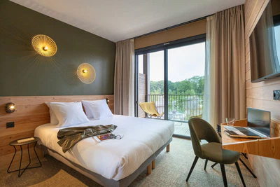 Hier in Versailles, vor den Toren von Paris, ist ein geselliges, familienfreundliches Hotel im Grünen entstanden, das für alle offen ist und mit einfachen, lokalen Speisen und Getränken überzeugt. Die 53 Zimmer, darunter 23 im Hauptgebäude und 30 unabhängige Holzchalets, sind in einem warmen, minimalistischen Stil eingerichtet und heißen Paare, Familien, Geschäftsreisende und Gruppen gleichermaßen willkommen. In unserem Zimmer duftet es herrlich nach Holz, und auf unserer Terrasse können wir abends die Amseln aus dem angrenzenden Schlosspark beobachten. Eine Übernachtung im Hôtel le Bout du Parc verspricht eine neue Erfahrung in Versailles, ganz in der Nähe des Schlosses und seines Parks und nicht weit von Paris und seinen Sehenswürdigkeiten entfernt.