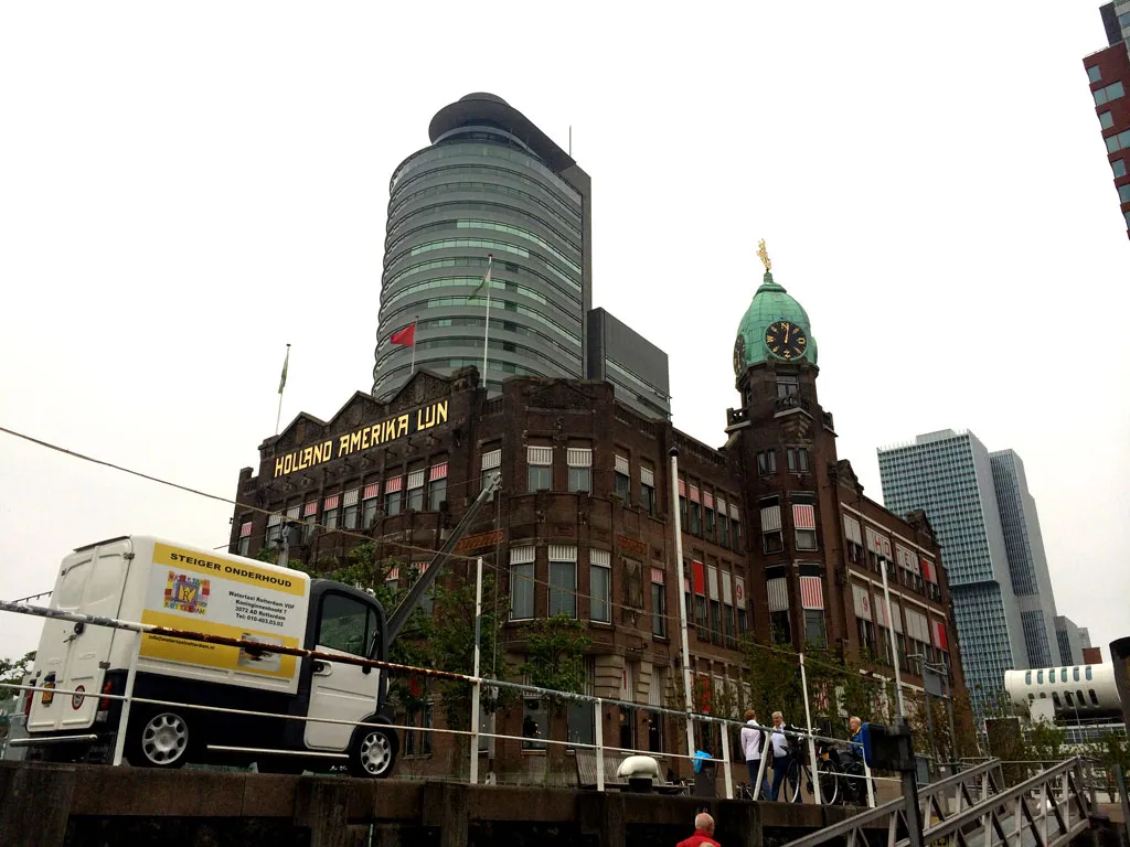 Paul inspiziert unser Zimmer und ruft: „Guck mal, wir haben sogar einen Fernseher, eine Dusche, ein Klo und … wann fahren wir jetzt eigentlich los?“ Okay, Paul findet es erst einmal sehr schade, als wir ihm erklären, dass das Schiff nicht ablegt. Aber wir versprechen ihm, dass wir gleich mit einem ganz schnellen Boot zum Mittagessen los düsen. Hier im Hafen ist das Transportmittel Nr. 1 das Wasser-Taxi. Wir haben eins an der Rezeption bestellt und warten nun auf dem Schwimm-Ponton direkt neben der SS Rotterdam. Ein gelbes Motor-Boot rast vorbei. „Wow, die sind ja cool!“ Das nächste Wassertaxi ist dann tatsächlich unseres. Es fährt eine wilde Kurve, Wasser spritzt und es hält an unserem Ponton. Als der gelbe Flitzer Gas gibt, wird Paul ein bisschen blass und hält meine Hand. Ganz rasant schnell geht´s durch den Hafen Richtung Rotterdam City zum Lunch. Noch eine scharfe Kurve und wir sind da. Paul hat inzwischen wieder etwas Farbe im Gesicht und will gar nicht aussteigen. Direkt an der Spitze des Wilhelminapiers steht das Hotel New York, eines der schönsten historischen Gebäude der Stadt, das früher das Hauptquartier der Holland-Amerika war.