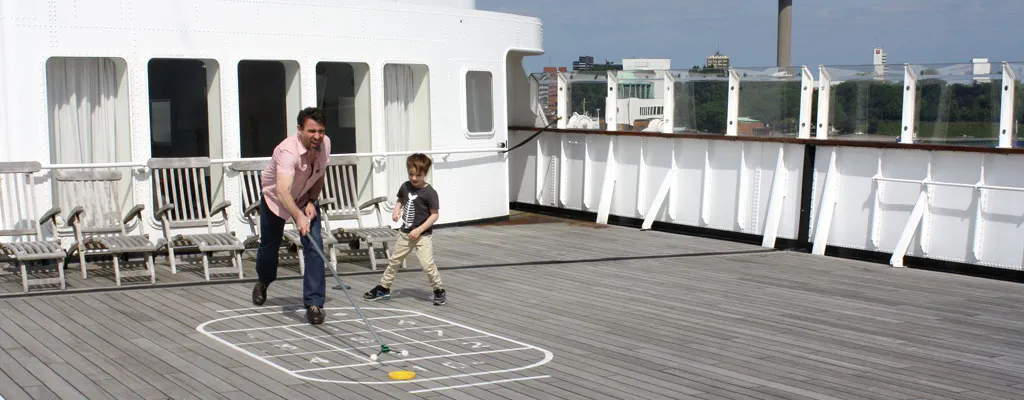 Paul ist begeistert, als wir vor der SS Rotterdam stehen: „Cool, das ist ja ein richtig großes Schiff!“ Ja, die SS Rotterdam ist ein stolzes Dampfschiff, das früher auf der Holland-Amerika-Linie fuhr und heute als schwimmendes Hotel im Hafen liegt. Kids sind hier an Bord besonders willkommen. Paul darf sich an der Rezeption auf das ”Kids Check-in” Treppchen stellen und als vollwertiger Gast der SS Rotterdam einchecken. Er bekommt sogar einen kleinen Willkommensbrief in einer Flaschenpost. Und als ob das noch nicht genug ist, liegt auf unserem Zimmer ein Begrüßungs-Plakat „Welkom kleine Kapitein, Paul!“ Wir haben eine hübsche Kajüte im Stil der fünfziger Jahre. Kreuzfahrt-Bilder an den Wänden erinnern an die goldenen Zeiten des Luxusliners. Es gib drei verschiedene Themen bei den Kajüten bzw. den Hotelzimmern: Original, Manhattan und Bahamas. Wir haben das fröhliche Design der Bahamas mit buntem exotischem Blumendesign. Aus den beiden Bullaugen-Fenstern blicken wir auf die Skyline von Rotterdam.