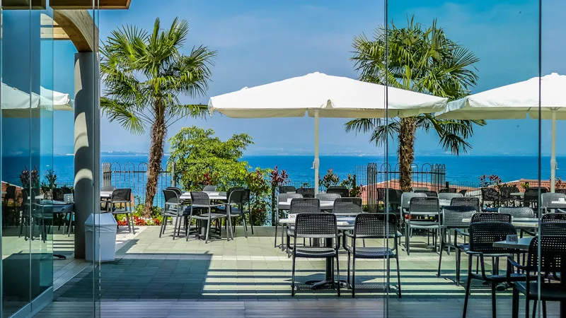 Wie perfekt diese Kombination funktioniert, erleben wir in Pacengo auf dem Lido Family Camping and Village. Vor der Rezeption werden wir an einem Pult empfangen und auf einer Anreise-Liste abgehakt, drinnen geht es zügig weiter mit unserer Anmeldung und dem Aushändigen eines Armbands mit Chip statt Schlüssel. Mit einem Lageplan finden wir uns anschließend problemlos auf dem 120.000 Quadratmeter großen Gelände zurecht, das sich leicht abfallend zwischen Uferstraße und See erstreckt. Unser Maxicaravan Lago Garden Superior liegt am unteren Ende in See-Nähe und ist mit einer Holzterrasse, einem Wohn-/Essbereich und zwei Schlafzimmern mit eigenem Bad ebenso praktisch wie wohnlich. Dank Klimaanlage lassen sich die hochsommerlichen Temperaturen gut aushalten. Zum Abkühlen gibt es außerdem den Gardasee und eine große Pool-Landschaft – je nachdem, ob wir Lust auf mehr oder weniger Gesellschaft haben.