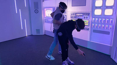 Auf der Spielfläche gibt es eine atmosphärische Lichtshow aus Projektionsmapping und Raumbeleuchtung, ein intensiver Surround Sound und haptische Interaktionsmöglichkeiten. Bei der 10-minütigen Demoversion reisen Paul und Nick mit der Zeitmaschine zurück in die 50er-Jahre und suchen im virtuellen Raum via Joystick nach wichtigen Infos und Hinweisen. Schubladen werden aufgezogen, alte Disketten durchsucht. Ich kann mir das auf dem Bildschirm des Game-Leiters anschauen. Tatsächlich passt der erste Schlüssel. Aufgabe perfekt gelöst! Cool!