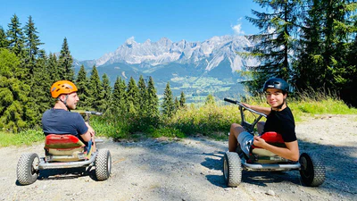 Das „Harley-ähnliche“ Funsport-Gerät auf drei breiten Reifen ist eine spannende Abwechslung, wenn’s darum geht, ins Tal zu düsen! Tickets für den Spaß gibt´s unten beim Sportgeschäft Ski-Lenz Reiter. Dann fahren wir erst einmal mit der Hochwurzen-Gondel hoch. Oben stehen die heißen Gefährte schon bereit und es gibt eine kleine Sicherheits-Einweisung am Start. Helme auf und los geht´s! Auf 7 km brausen wir Kurve um Kurve mit unseren Mountain GoKarts durch eine wunderschöne Naturlandschaft vom Gipfel bis ins Tal. Das Ennstal, die Schladminger Tauern und das Dachstein Massiv präsentieren sich heute bei Sonnenschein von ihrer schönsten Seite. Berg abwärts geht es mit richtig Speed -nur Bremsen und Lenken ist angesagt. Was für ein Spaß! Wir sind mit einer kleinen Foto-Pause ca. 25 Minuten unterwegs. Unten an der Talstation angekommen sind meine Jungs so begeistert, dass sie gleich nochmal hoch möchten …