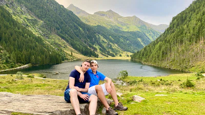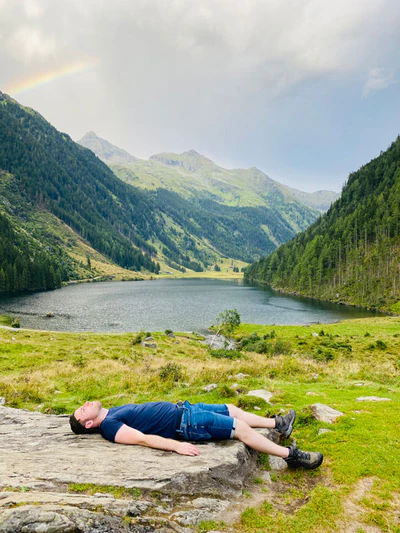 Wir gehen den „Alpinsteig Höll“. „Höll“ heißt eigentlich ‚Höhle“, aber hier ist „Höll“ eventuell auch bisschen Programm. Nicht umsonst steht der Hinweis: „nur für Geübte mit Trittsicherheit, Kondition und Schwindelfreiheit.“ Wir meistern 500 Stufen und steile Metallstiegen, klettern über Felsbrocken und kleine Brücken. Das Highlight ist die lange, wackelige, schwindelerregend hohe Hängebrücke. Paul rennt voraus, ich geh mutig hinterher und rufe ängstlich: „Bitte nicht wackeln!“ Auf der 50 Meter (!) langen Hängebrücke schauen wir von oben auf den Wildbach und in die Höllschlucht. Es ist ein wirkliches Abenteuer vorbei an tosendem Wasser und gewaltiger Natur zu wandern. Oben angekommen wartet als Belohnung der Riesachsee mit unglaublichen Bergpanorama! Am Ende des Tages sind wir dann ganz allein da oben in dieser gewaltigen Kulisse. Wir setzen uns auf einen Felsen und saugen diese unglaubliche Stimmung in uns auf! Was für ein Highlight schon am ersten Tag! Zurück geht es übrigens ganz entspannt den breiten Forstweg zum Seeleitenparkplatz runter.