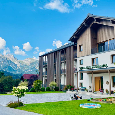 Bei strahlendem Sonnenschein kommen wir in Schladming an. Unsere „Homebase“ ist das bezaubernde Thalers Marianderl mit Blick zum Dachstein und den Schladminger Tauern. Auf der Sonnenterrasse und im Garten entspannen die Gäste. Vor dem Haus spielen Kinder und wir fühlen uns sofort wohl und wie zuhause. Unser Zimmer ist wunderschön: moderne Architektur mit liebevollen Details. Für mich ein gemütliches Doppelbett und für die Jungs nebenan ein geräumiges Zimmer. Individuell und einladend eingerichtet. Das Highlight ist der Balkon mit Schaukelsessel. Den schnappt sich gleich Paul zum Chillen. Doch wir haben keine Zeit zu verlieren, denn wir wollen uns nur kurz frisch machen, die Wanderschuhe anziehen und uns ins erste Abenteuer stürzen. Gastgeberin Theresa stellt uns noch an der Rezeption die Sommercards aus, denn die brauchen wir schon für unser erstes Highlight: