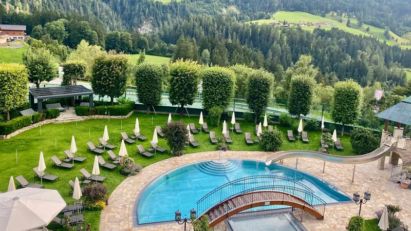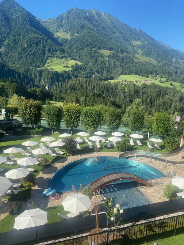 In unserem Zimmer, das eigentlich eine Juior-Suite ist, fühlen wir uns sofort wohl, denn es ist sehr geräumig, hat ein riesiges Doppelbett, ein stylisches Badezimmer und einen großen Balkon mit Blick auf die umliegenden Berge. Wow. Alles ist geschmackvoll eingerichtet, die Farben sind aufeinander abgestimmt und man sieht das hier ein richtiges Designkonzept dahintersteckt. Sobald wir ausgepackt haben wollen wir natürlich das neue Highlight im Hotel Berghof entdecken: Das nagelneue Rooftop Spa. Das exklusive Adults-Only Spa liegt auf dem Dach des Berghofs und bietet einen atemberaubenden Infinitypool, der zum Schwimmen und Relaxen mit Blick auf die umliegende Bergwelt einlädt. Hier können Eltern die Seele baumeln lassen, während die Kinder im liebevoll gestalteten Kinderclub bestens betreut werden. Wir sehen hier aber auch Gruppen von Freundinnen, Mütter und Töchter und auch viele Paare. In kuschlige Bademäntel gehüllt, suchen wir uns ein Plätzchen auf der Außenterrasse und können uns nicht sattsehen an dem Ausblick auf das Panorama der Berge. Die Gäste können sich an Tee und Nüssen bedienen, es gibt jede Menge Zeitschriften und bei schlechtem Wetter sogar einen Kamin drinnen. Also hier ist wirklich ein wunderbares Plätzchen zum Entspannen und Runterkommen entstanden.