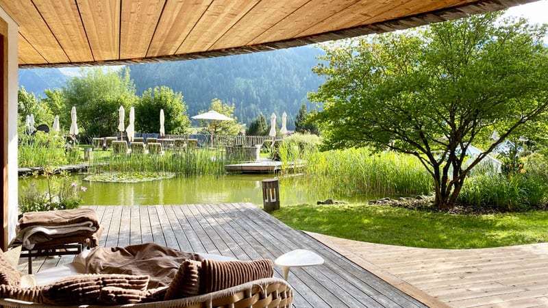 Aus dem Spa-Labyrinth treten wir ins Freie, neben uns ein Naturwasserfall, und wir blicken auf den Jungbrunn Quell-Naturteich mit wunderbarem Ambiente. Hier suchen wir uns ein lauschiges Plätzchen auf der Panorama-Liegegalerie. So schön ist diese Kulisse: Das Wellness-Ensemble geht nahtlos in die Bergwiesenlandschaft über, gekrönt von einer großartigen Gipfelkulisse. Wir starten mit einem Saunagang in der 3D-Sauna. Danach klettern wir mutig ins eiskalte Quellwasser und schwimmen eine Runde. Herrlich! Dann ist erst einmal Chillen angesagt. In der urigen Erdsauna gibt es später noch einen Aufguss mit Menthol. Man sieht gar nichts mehr in den Dampfschwaden, aber unsere Lungen sind durchgelüftet. Dann wieder eine Schwimmrunde im eisklaren Quellwasser, dann wieder Chillen… Ein Wellness-Ritual an einem perfekten Ort…“