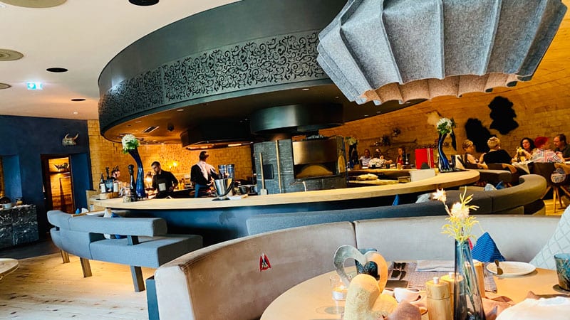 Wenn wir nicht irgendwann hungrig geworden wären, wären wir einfach auf unserer Liege an der Jungbrunn Quelle liegen geblieben, aber im Jungbrunn gibt es auch noch weitere gute Orte. Für unseren ersten Abend ist ein Tisch im Grill reserviert. Flammen schlagen und am Feuer wird wild gebrutzelt. Krosse Spezialitäten vom Grill, egal ob Fleisch, Fisch oder Gemüse – hier ist das ganze Jahr Grillsaison. Alles frisch zubereitet am offenen Holzkohlegrill mit frisch gebackenem Brot aus dem Steinbackofen. Runde Lederbänke und große Filzlampen wirken sehr kosmopolitisch und gemütlich. Wenn wir nicht wüssten, dass wir im ruhigen Tannheimer Tal sind, hätten wir an London oder Manhattan gedacht. Zur Vorspeise Jacobsmuscheln, zum Hauptgang ein köstliches Steak und sehr netter Service.
