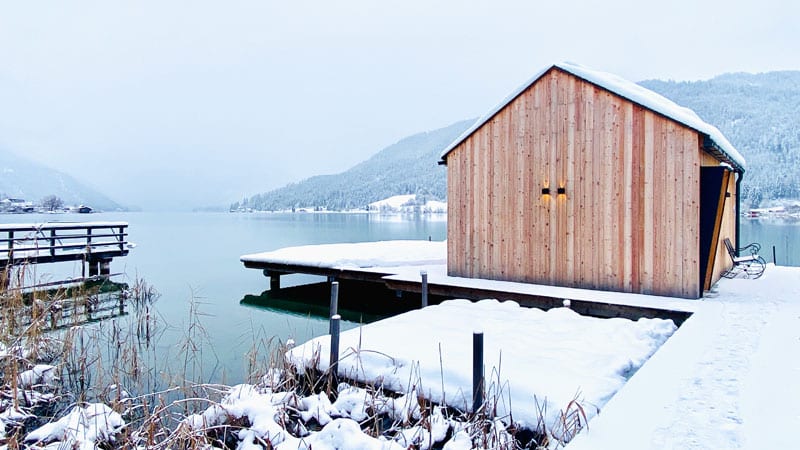 Also geh ich im Bademantel und Winterstiefeln, mit Spa-Tasche den kleinen Weg bei den Chalets entlang und überquere die Straße. Ich bin ja schneidig! Das Setting ist ein Traum: ein schmaler Weg führt zum Holzhaus, das steht schlicht und schön am Wasser, daneben der Holzsteg zum See, alles weiß gepudert. Drinnen schwitze ich in der herrlichen Panorama-Sauna mit Blick auf den Steg und einen Stock höher im Ruheraum suche ich mir ein Logenplätzchen. Nur Fensterglas trennt mich vom Weißensee-Ambiente. Zwischen Saunagang und Ruheraum, mach ich natürlich einen Abstecher nach draußen zum See. Vorsichtig geh ich Schritt für Schritt die Stufen ins Wasser. Unglaublich wie klar der See ist, man sieht jeden Stein. Ich schaff es bis zum Bauchnabel ins eiskalte Wasser, dann flüchte ich wieder ins warme, gemütliche See-Spa.