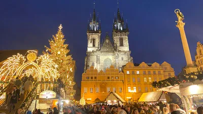 Prunkvolle Fassaden rahmen gleich neben dem Alten Rathaus den wichtigsten historischen Platz Prags ein. Er entstand im 12. Jahrhundert und war Zeuge zahlreicher historischer Begebenheiten. Hier stehen die Kirche St. Maria vor dem Teyn, die Barockkirche des Hl. Nikolaus, der Rokoko-Kinsky-Palais und der gotische Stadtpalais „Haus zur steinernen Glocke“. Auch das monumentale Denkmal von Meister Jan Hus thront hier, von dem wir schon im Rathaus gehört haben. Unsere Führerin erzählte uns, dass im Pflaster des Platzes der Hinrichtungsort von 27 tschechischen Herren (1621) sowie der Prager Meridian markiert ist. Davon sieht man in der Weihnachtszeit nichts. Denn auf dem zentralen Platz stehen bunte Buden, leuchtende Engelsskulpturen und der Duft von Maronen und Glühwein liegt in der Luft. Der Weihnachtsmarkt auf dem Altstädter Ring ist der bekannteste Markt in ganz Böhmen und gilt als einer der schönste Weihnachtsmärkte Europas. Hier findet Ihr vor allem tschechisches Kunsthandwerk, darunter Glaskugeln in vielen Farben, Holzspielzeug und Keramik. Natürlich gibt es auch leckeres Essen, ob deftig oder süß.