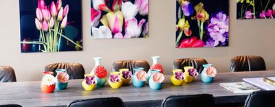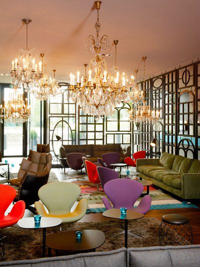 Mundgeblasene Glaskugeln der Firma Bocci sind Blumentopf und Leuchte in einem und werden regelmäßig von einem Gärtner begrünt. Sie hängen vor einer modernen Interpretation alter niederländischer Meister. Das Design wird von bunten Drehstühlen in Tulpenform, den sogenannten Swan-Sesseln von Fritz Hasen, ergänzt.