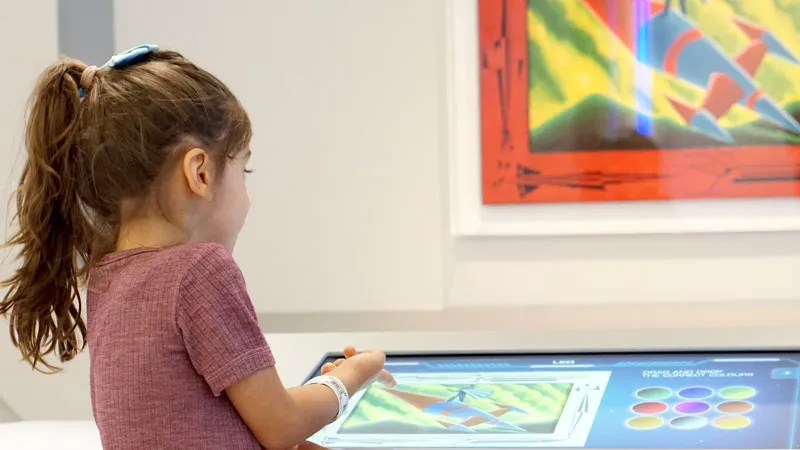 Als wir uns sattgesehen und -gehüpft haben, gehen wir ins hauseigene „Children‘s Museum“. Leo ist aufgeregt, ein eigenes Museum für Kinder! Er bekommt ein Armband mit Barcode, und los geht’s – ins Weltall. Es ist dunkel, Sterne überziehen die Wände, Weltraum-Sounds lassen echte Space-Stimmung aufkommen. Mit seinem Armband kann Leo an jeder Station einchecken, dann erscheint sein Name auf einem Display und er kann ein Spiel spielen. Einmal soll er astronomische Messinstrumente so sortieren wie er sie in der Vitrine sieht, nämlich chronologisch nach deren Entwicklung: von der Sonnenuhr bis zum Satelliten. An einer anderen Station gilt es, eine Rakete in den Farben auszumalen, die er auf einem Bild an der Wand sieht.