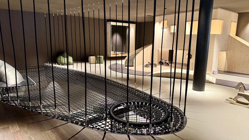 In der Lobby fällt sofort ein riesiges Netz ins Auge, in das sich Kinder hineinfallen lassen können. Gleich daneben gibt es einen Kletterbereich mit Heuboden, der zum Balancieren und Klettern einlädt. Besonders schön ist der „Kidsclub“. Hier können die Kleinen in thematisch gestalteten Holzhäuschen spielen, die wie eine Tankstelle, eine Arztpraxis, ein Theater oder ein Krankenhaus eingerichtet sind. Die Kinder düsen mit Bobbycars – die wie kleine Vespas aussehen – durch den Raum, während eine gemütliche Kuschelecke mit Sitzsäcken zum Entspannen einlädt.