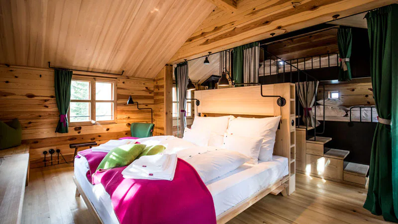 Zwischen den Häusern liegt ein Dorfplatz mit Brunnen und Feuerstelle und eine Partyscheune mit 30 Sitzplätzen zum Zusammenkommen oder falls die Feste, die gefeiert werden wollen, den Rahmen der einzelnen Hütten sprengen. Von den drei Hütten aus, die nach den Kindern von Hollmann benannt sind – Franzi, Toni und Luki – startet man im Sommer zu Wanderungen oder Mountain- und E-Bike-Touren in den Nockbergen, um danach mit dem Nocky Flitzer durch die Landschaft zu kurven. Entspannen kann man beim Schwimmen am See oder in der nur 20 km entfernten Therme in Bad Kleinkirchheim.