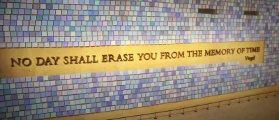 Um die Becken herum gibt es einen Park mit Bäumen und hier finden wir auch das das 9/11 Memorial Museum, ein Pavillon mit sieben unterirdischen Etagen, die die Überreste der Anschläge des 11. Septembers zeigen. Die schräge Glas-Fassade wirkt wie die Trümmer, die damals aus dem Ground Zero ragten. Innen stehen Trümmerreste der alten Türme wie Mahnmale. In der Ausstellung erleben wir als Besucher noch mal den 9/11 über Bildschirme mit original Nachrichten-Sendungen. Große Fotos von Menschen, die geschockt nach oben schauen und nicht fassen können, dass ein zweites Flugzeug in die Türme fliegt… Sehr bewegend und ausführlich wird hier dokumentiert, was stündlich passierte. Wie die Tage danach waren und wie getrauert wurde, aber auch wie die New Yorker wieder Mut gefasst haben. Unten in den Tiefen des Museums bewegen wir uns entlang der Fundamente der alten Twin Towers. Ein Überdimensionales Mosaik entstand aus den alten Fliesen der Eingangshalle des alten Worl Trade Centers.